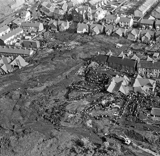 On 21 October 1966, a slag heap from the coal mines collapsed onto the village of Aberfan in Wales. The mine spoil rished down the hill and engulfed a school, killing 116 children and 28 adults.