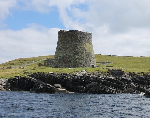 Note: Mousa Broch is a well-preserved iron age round tower, built from stone. The ancient pier is Sandsayre Pier, where seals sometimes lie.